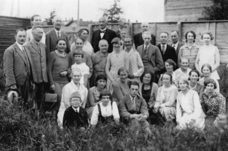 ![]() Mustosten ensimmäinen kokoontuminen Kajaanissa 15.6.1929. Kuvassa takana keskellä Artturi Lönnbohm, suvun ensimmäinen esimies, Eino Leinon isoveli. Toisessa rivissä ensimmäisenä ja kolmantena vasemmalta aloitteentekijät Yrjö ja siskonsa Kerttu Mustonen. |